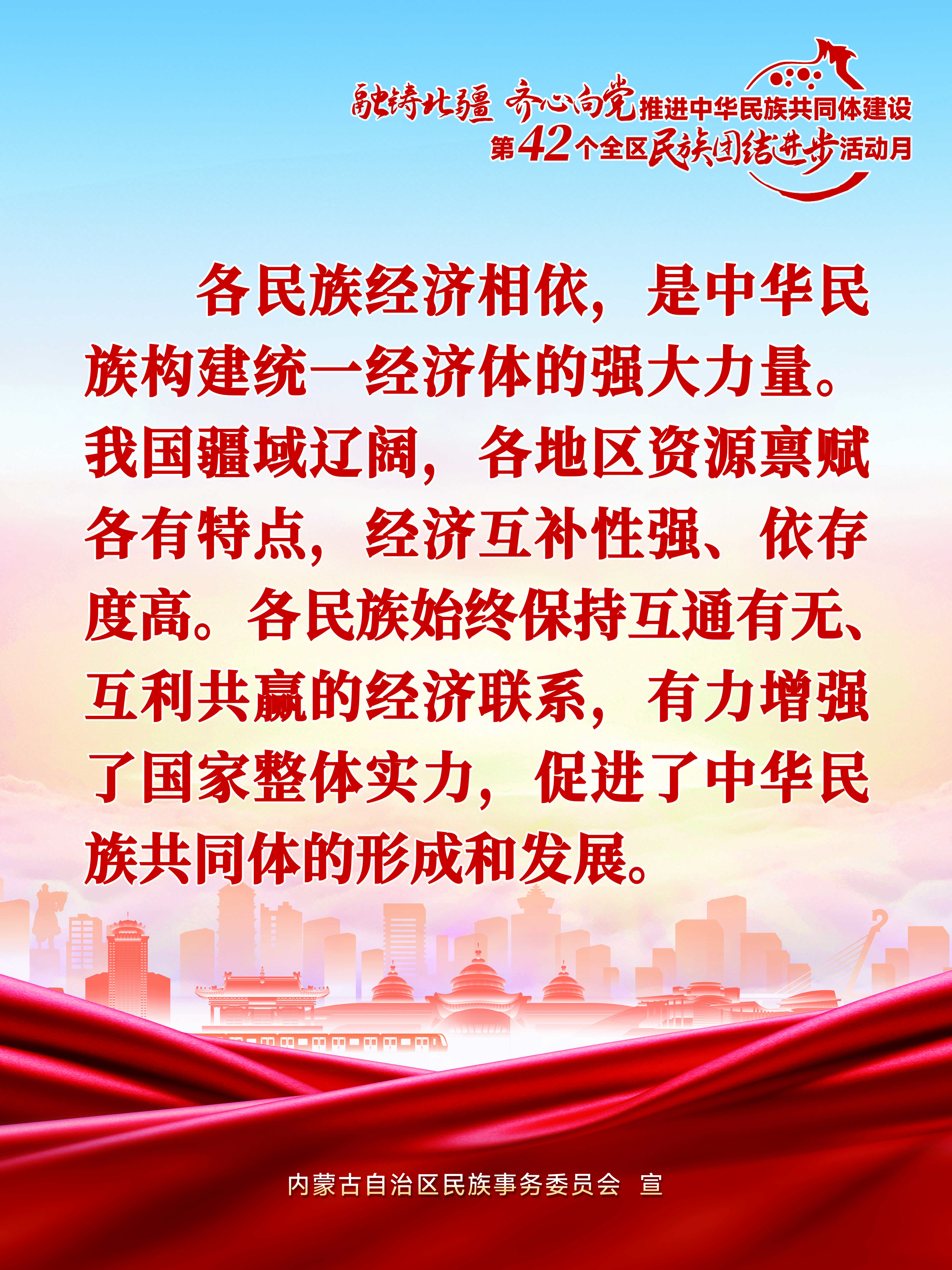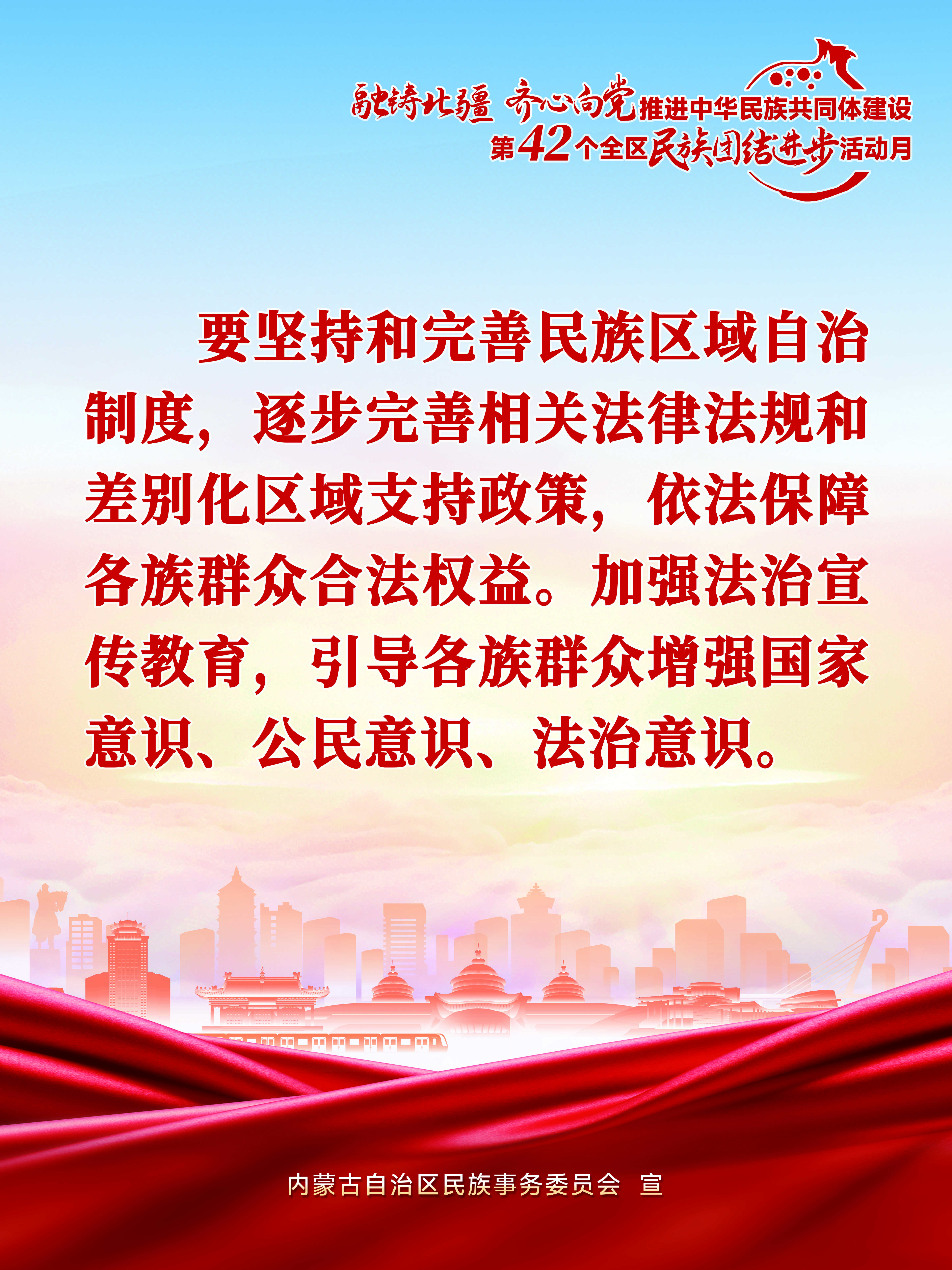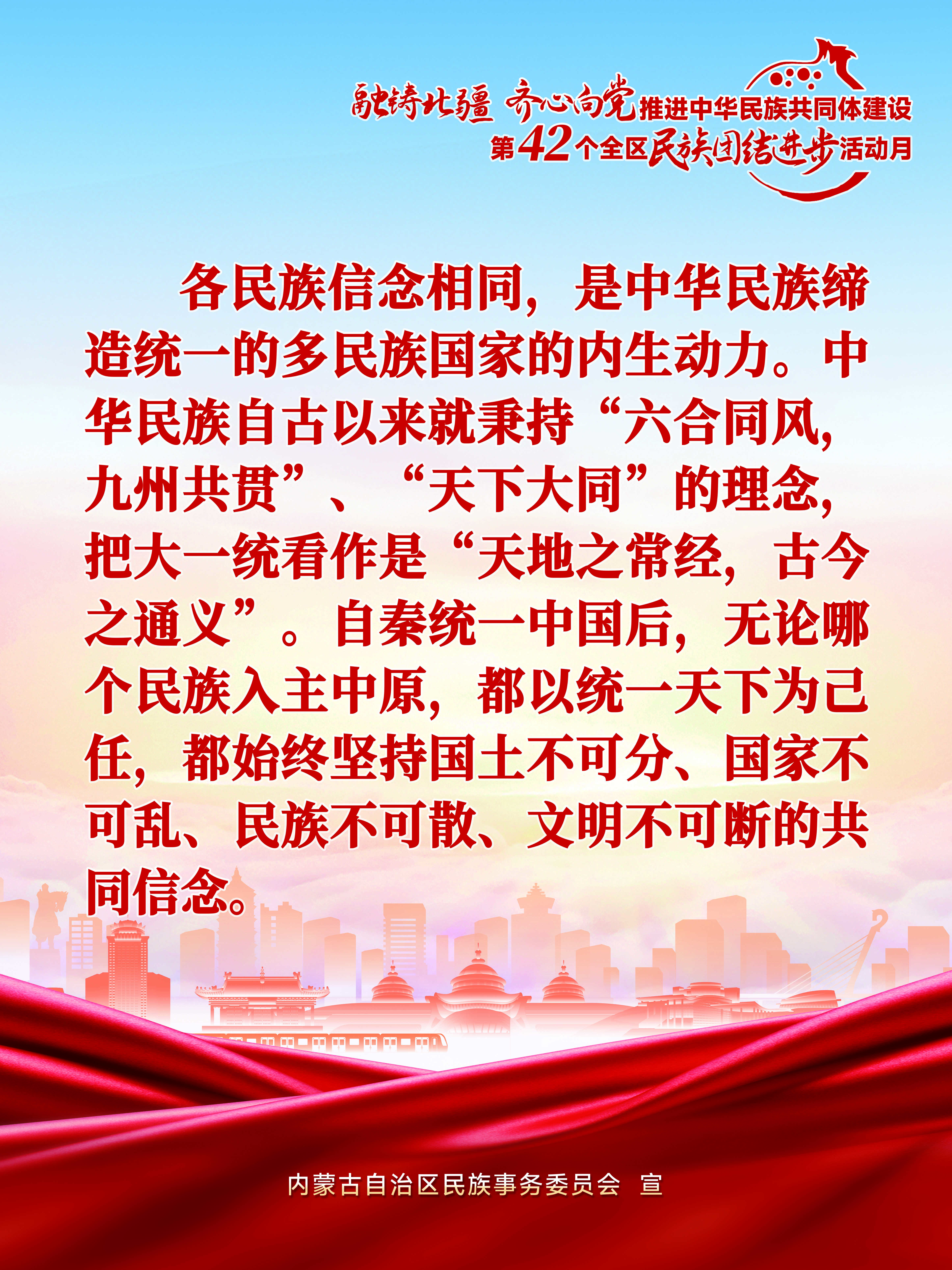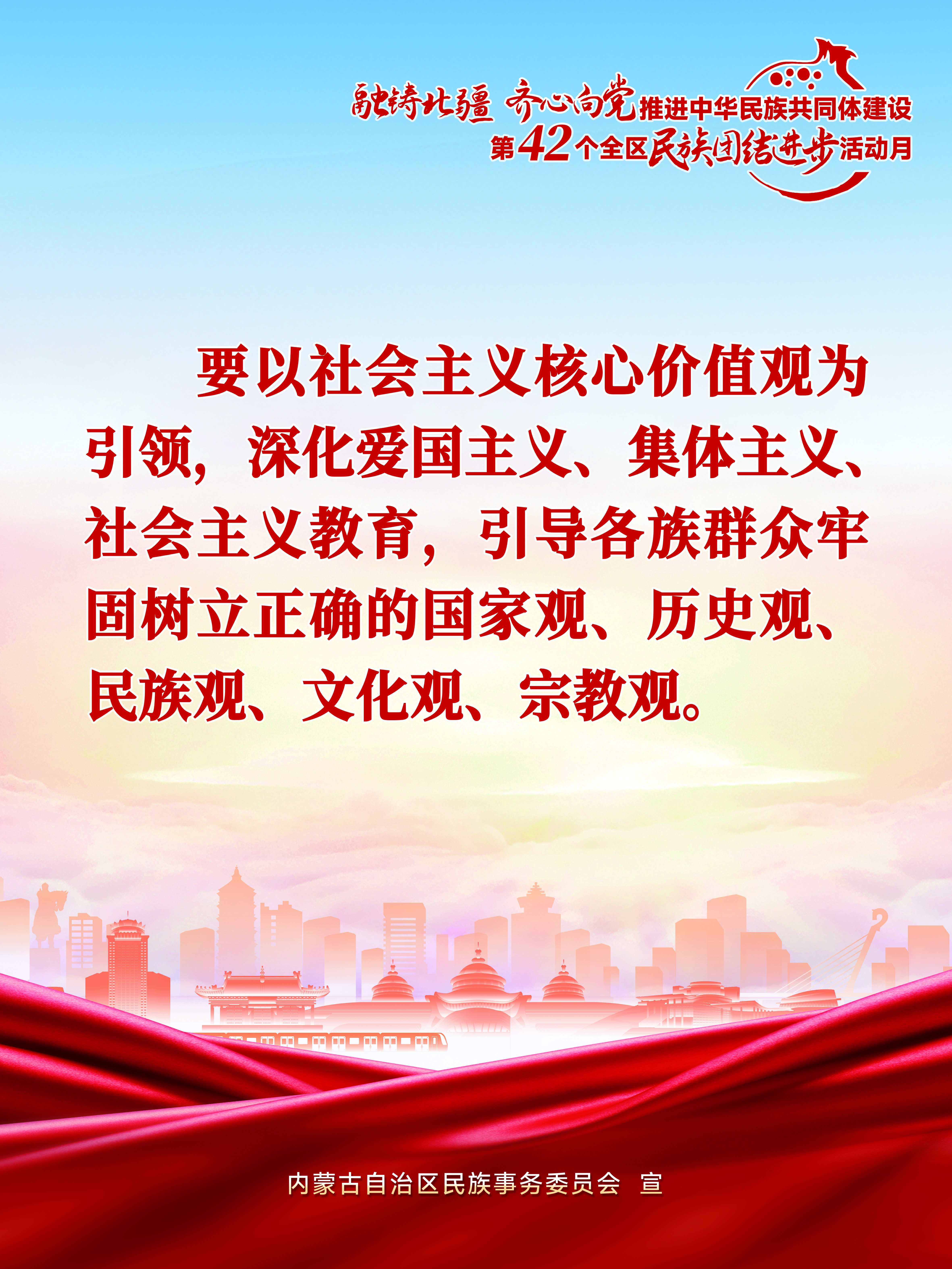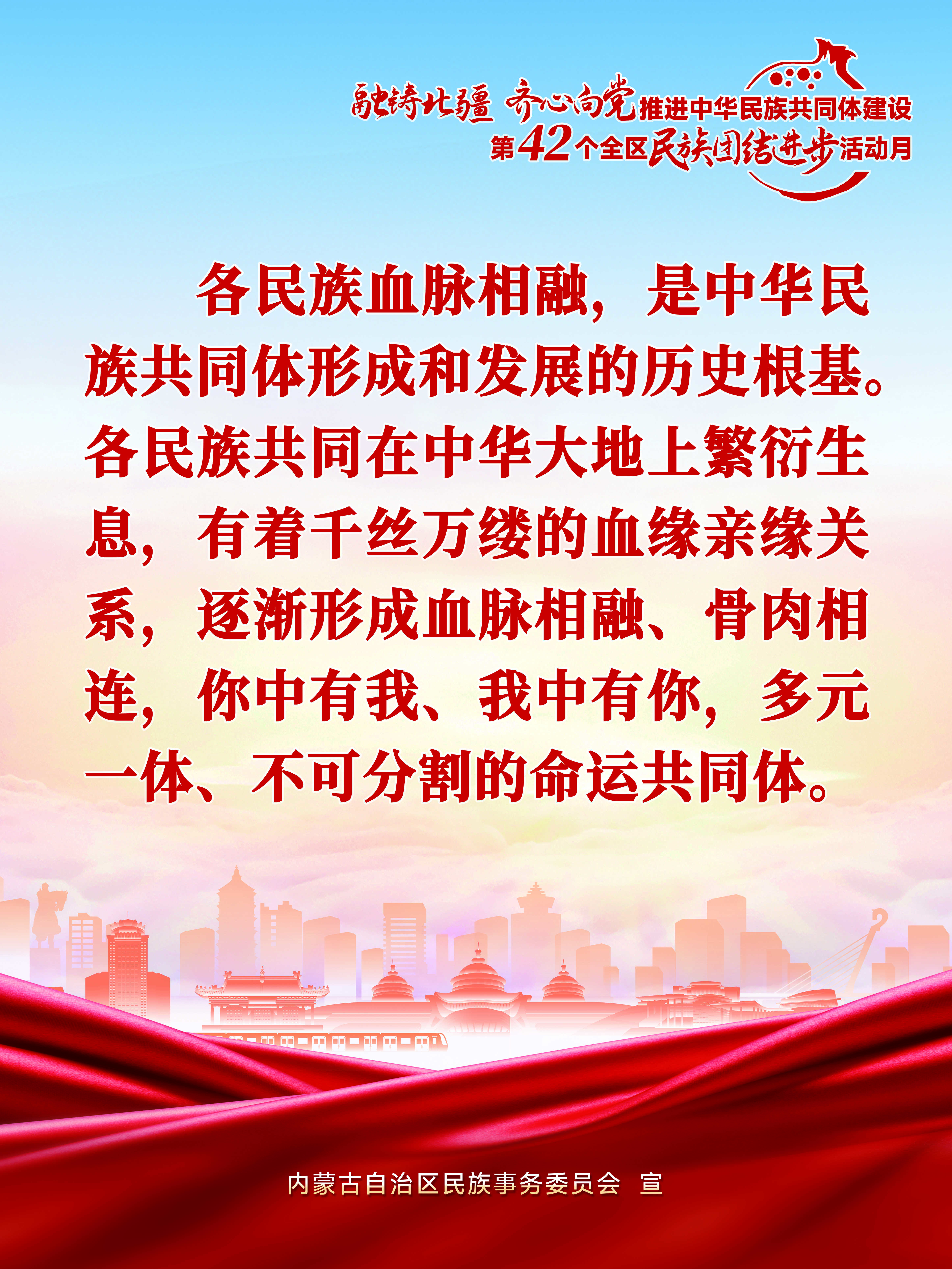 2025年9月是第42个全区民族团结进步活动月。为做好第42个全区民族团结进步活动月工作,深入学习宣传习近平总书记关于加强和改进民族工作的重要思想,生动讲好新时代内蒙古民族团结进步故事,自治区民委广泛征求民族团结进步主题素材、认真提炼总结民族团结进步故事,精心设计制作推出第42个全区民族团结进步活动月主题系列海报,现进行广泛推广和宣传,欢迎大家下载使用、积极转载,共同讲好新时代内蒙古推进中华民族共同体建设故事!